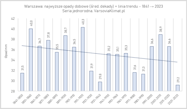 Aby omówić drugi aspekt, posłużę się cytatem: „Za zalane miasto nie ma co obwiniać służb. Instalacje projektowano dziesiątki lat temu, gdy nie było jeszcze takich gwałtownych opadów, a klimat się zmienia. Nie mają szans przyjąć całej wody, gdy spada taki deszcz. To musiało się tak skończyć.” (rzecznik prasowy IMGW, cyt. za Wyborcza.pl). Teza, że ekstremalne opady [dobowe] są coraz „gwałtowniejsze” nie jest łatwa do udowodnienia, należałoby wykonać drobiazgowe badania sum opadu w jednostkach czasu. Jednak często głoszona jest w mediach teza pokrewna, a mianowicie że ekstremalne sumy takich opadów są coraz większe (w związku z obecnym ociepleniem klimatycznym). Tu jest łatwiej, mogę porównać średnie (np. dekadowe) wartości najwyższych (w całym roku) opadów dobowych. Jest to przedstawione na poniższym wykresie (1) obejmującym okres 1841-2023.
