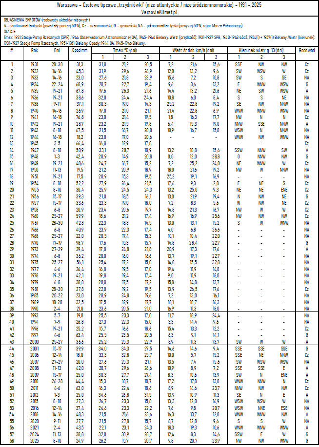 Oto tabela lipcowych niżów genueńskich / czarnomorskich / atlantyckich z ostatnich 95-ciu lat, które przyniosły znaczne sumy opady w trzech kolejnych dniach. Nie dopatrzyłem się klasycznych lipcowych „trzydniówek” w 37 latach (1937, 1939, 1946, 1952, 1953, 1959, 1962, 1963, 1964, 1965, 1967, 1969, 1971, 1972, 1976, 1980, 1982, 1983, 1984, 1986, 1987, 1988, 1991, 1992, 1995, 1998, 1999, 2002, 2003, 2004, 2005, 2013, 2014, 2017, 2019, 2022, 2023). Pamiętać trzeba, że przyjąłem sztywne kryterium trzech kolejnych dni dających w sumie największy opad z danego miesiąca. W wielu z wymienionych 37-miu lat pojawiały się incydenty opadowe o zbliżonym charakterze (np. dwa, cztery albo więcej kolejnych dni opadowych, albo trzy dni rozdzielone jednym bezopadowym, itd.), a także – rzecz jasna – pojedyncze dni opadowe. Tych wszystkich nie uwzględniłem w tabeli.