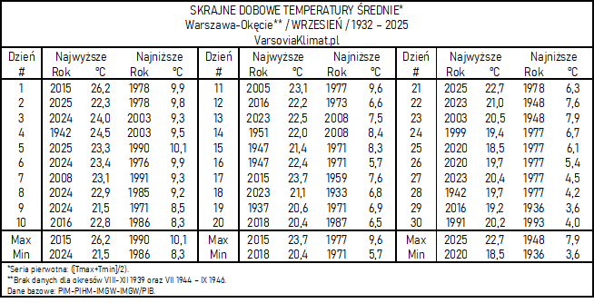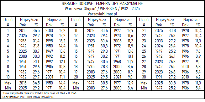 Okęcie 1932-2025: Skrajne dobowe Tśr / Tmax / Tmin września
