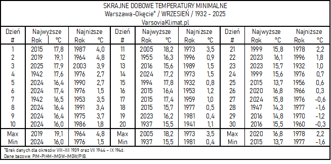 Udział obecnego stulecia w liczbie rekordowo ciepłych (wg dobowych temperatur minimalnych) dni wrześniowych wynosi 22 (ostatnio taki rekord pojawił się w roku 2024). W klasyfikacji wartości rekordowo niskich, na wiek XXI przypada tylko 1 dzień (3 września 2003).