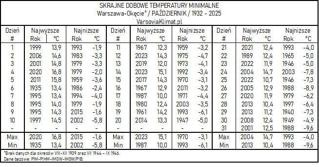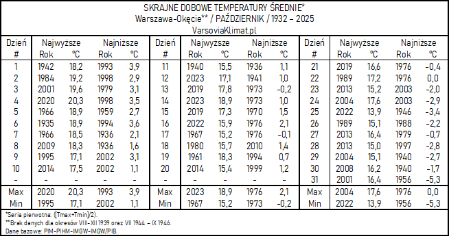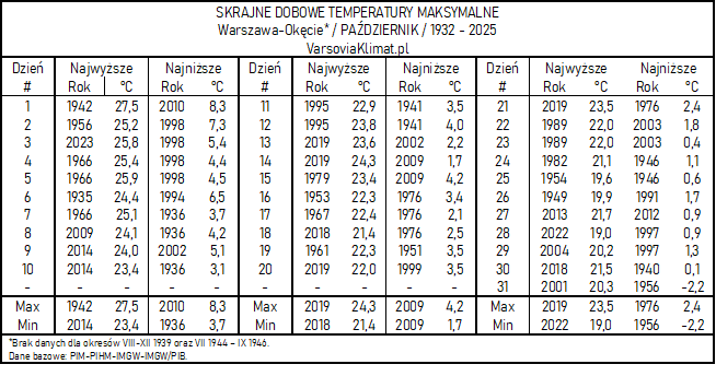 Okęcie 1932-2025: Skrajne dobowe Tśr / Tmax / Tmin października