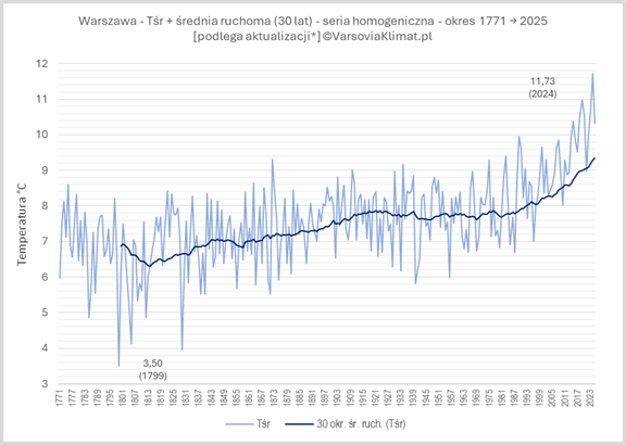 Dość popularny jest pogląd, że ocieplenie klimatu to kwestia ostatnich kilkunastu, ewentualnie kilkudziesięciu lat. To nieprawda, gdyż obecna faza ocieplenia ma swoje początki w połowie XIX wieku, czyli od zakończenia tzw. Małej Epoki Lodowej (MEL, ochłodzenia klimatycznego trwającego od średniowiecza), co powyższy wykres ukazuje. Najzimniejszym rokiem w analizowanym okresie 1771-2025 jest 1799, ze średnią temperaturą (Tśr) zaledwie 3,50°C. (Okres najzimniejszy na wykresie częściowo pokrywa się z tzw. minimum Daltona, czyli czasem słabszej aktywności słonecznej, określonym (np. w Wikipedii) na lata 1790-1830. Po roku 1799, Tśr roczna już nigdy nie spadła tak nisko w Warszawie. Tylko roczniki 1829 (3,94°C) i 1805 (4,13°C) są porównywalnie zimne; skrajnie chłodne są też lata 1785 i 1812 (oba 4,86°C).