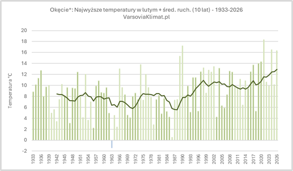 28 lutego 2026 roku na stacji Okęcie odnotowano 16,3°C (w klatce meteorologicznej). W prawie 100-letnich dziejach obserwacji na Okęciu, jeszcze wyższe maxima termiczne wystąpiły w lutym tylko trzykrotnie: w latach 1990 (17,2°C), 2021 (18,3°C – historyczny rekord dla tego miesiąca) oraz 2024 (16,5°C). (W rzeczy samej, przed rokiem 1990 – wstecz aż do 1779 – nigdy nie odnotowano oficjalnie tak wysokiej temperatury w lutym w Warszawie). Najniższa Tmax dla Okęcia przypada na rok 1963 (-1,4°C); jest to jedyny luty w którym nie było dodatniej temperatury przez cały miesiąc. Poniższy wykres ukazuje najwyższe temperatury lutego dla stacji Okęcie.