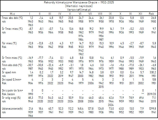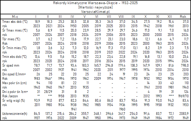 Okęcie: Miesięczne rekordy klimatyczne 1932-2025
